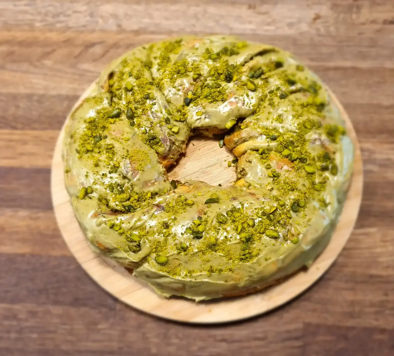 Naturaalse pistaatsiapastaga ja rohke kohupiimatäidisega luksuslik kringel.
