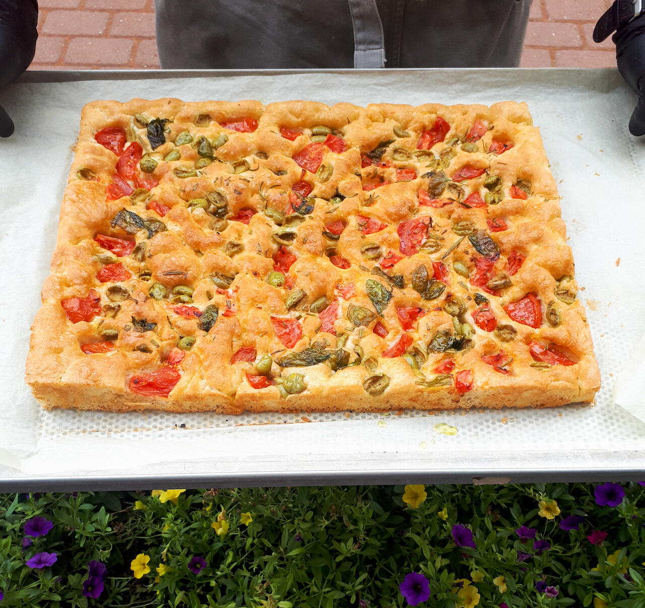 Koostisosad: nisujahu, pärm, oliiviõli, sool, tüümian, rosmariin, tomat, basiilik, oliivid.