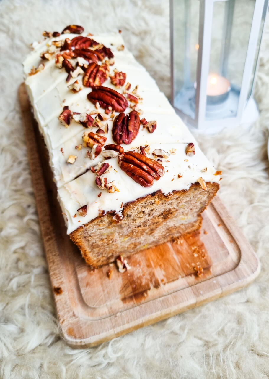 Koostisosad: nisujahu, sooda, kaneel, sool, või, roosuhkur, muna, vaniljesuhkur, pett, banaan, maapähklikreem, toorjuust, pekaanipähkel.