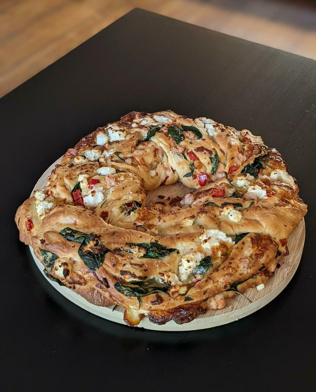 Ingredients: buttermilk, yeast, salt, egg, wheat flour, butter, sugar, cream cheese, mayonnaise, smoked chicken, bell pepper, mozzarella, feta cheese, spinach.