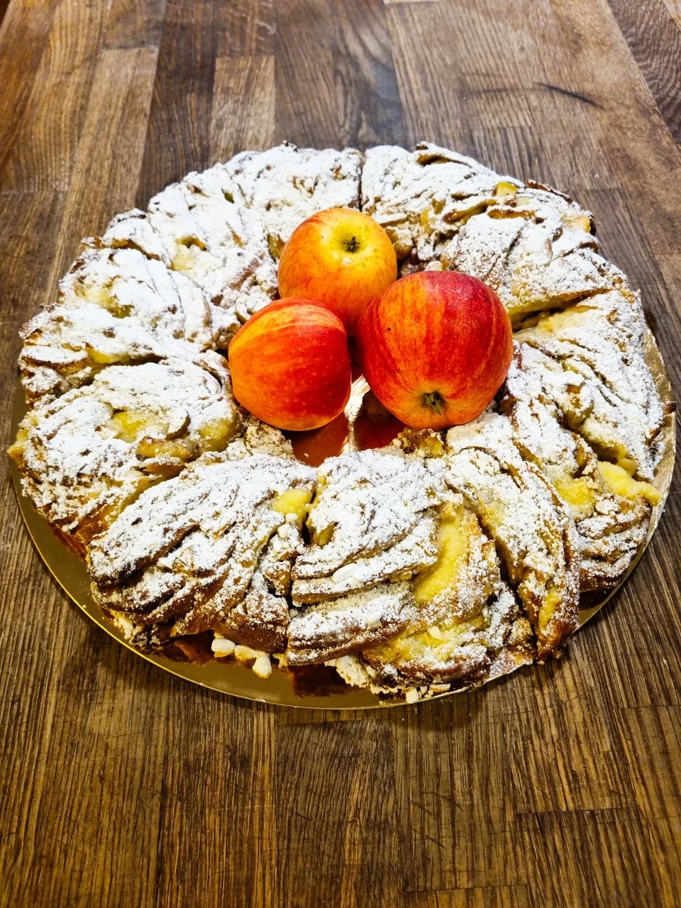 Ingredients: milk, yeast, sugar, egg, vanilla sugar, flour, butter, cinnamon, vanilla, apples, nutmeg