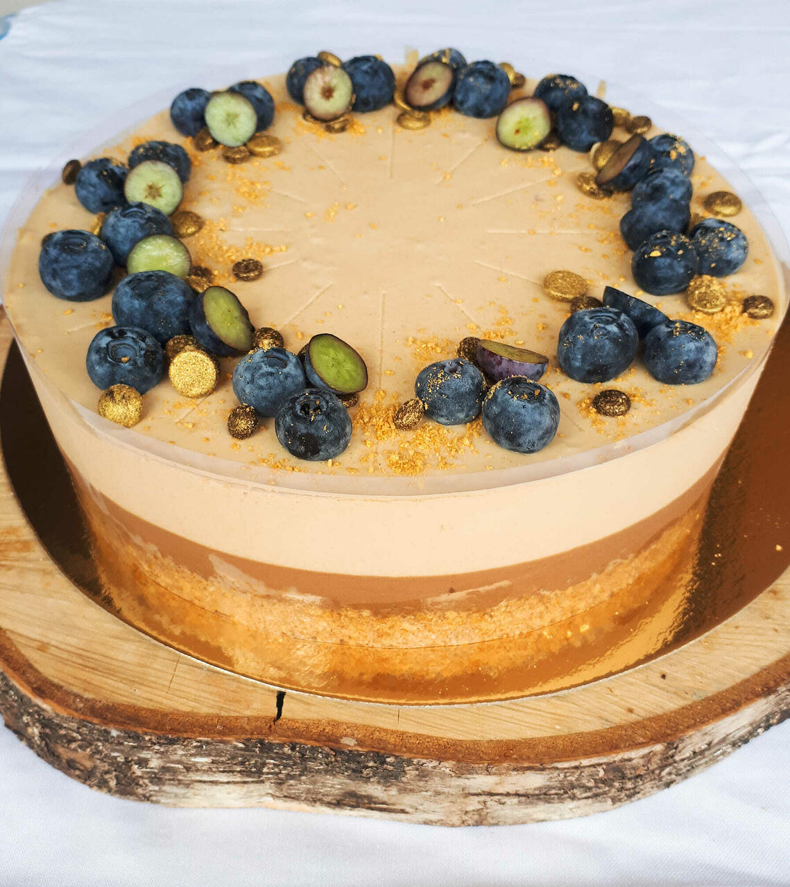 Ingredients: Digestive biscuit, margarine, powdered sugar, coconut cream, chocolate, espresso, agar-agar, almond liqueur, blueberries, almond flour.