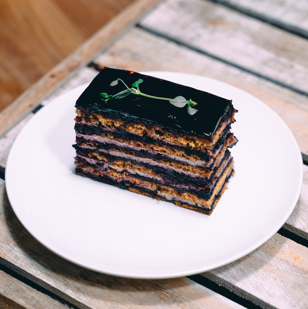 Ingredients: honey, sugar, egg, butter, salt, baking soda, flour, heavy cream, sour cream, blueberry jam, gelatine.